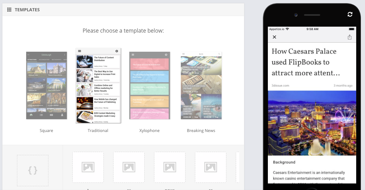 10. The next page will allow you to customise the colors, graphics and even some of the behaviours of the app. Start by selecting Save As in the top right corner to save the template as your own. You can read more about customising sections and the available options over here.