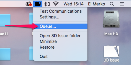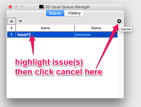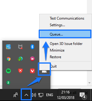 To cancel a issue can we please get you to right click on the 3D issue icon in your system tray and click on Queue, Please see the below screenshot.