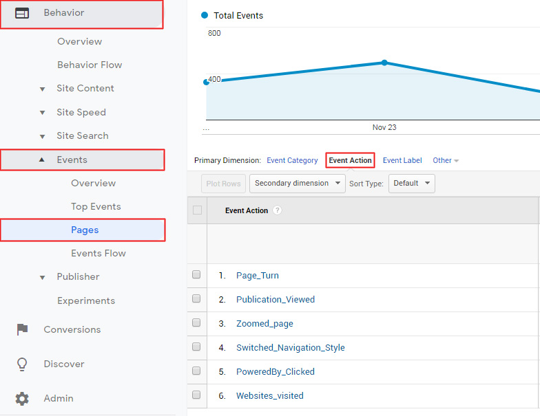 Here you will be able to view all the flipbook events tracked by Google Analytics.