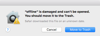 A reason for this could be that your offline.app file is not digitally signed and MacOS requires that all .app files are digitally signed in order to run. Similar windows 8, 8.1 and 10 have the same requirement.