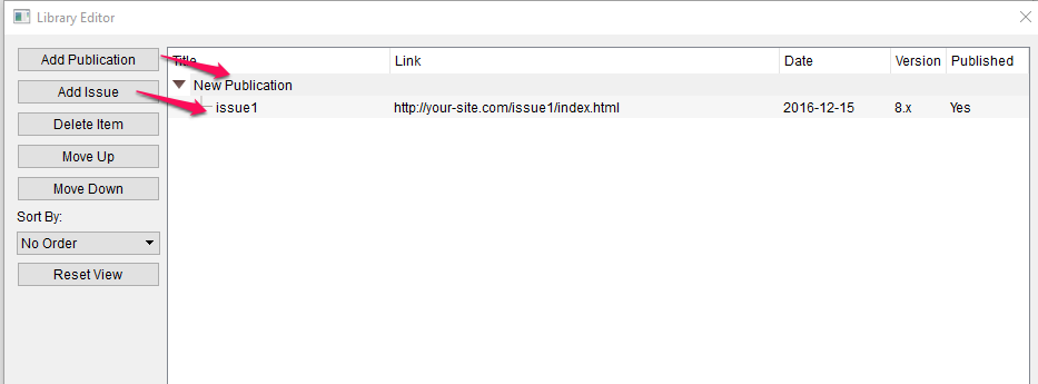- Then click Add Issue to add individual issues to the publication library. Give it a title and the URL link for viewing it online. Once done making changes, click Save Changes and your library files will be created in the folder you chose to store them.