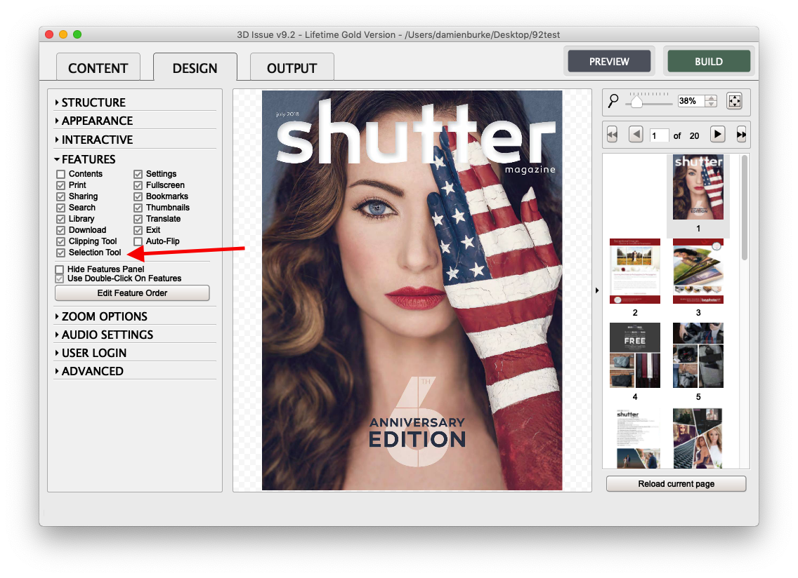 5. In the Design tab, enable Selection Tool under the Features menu.