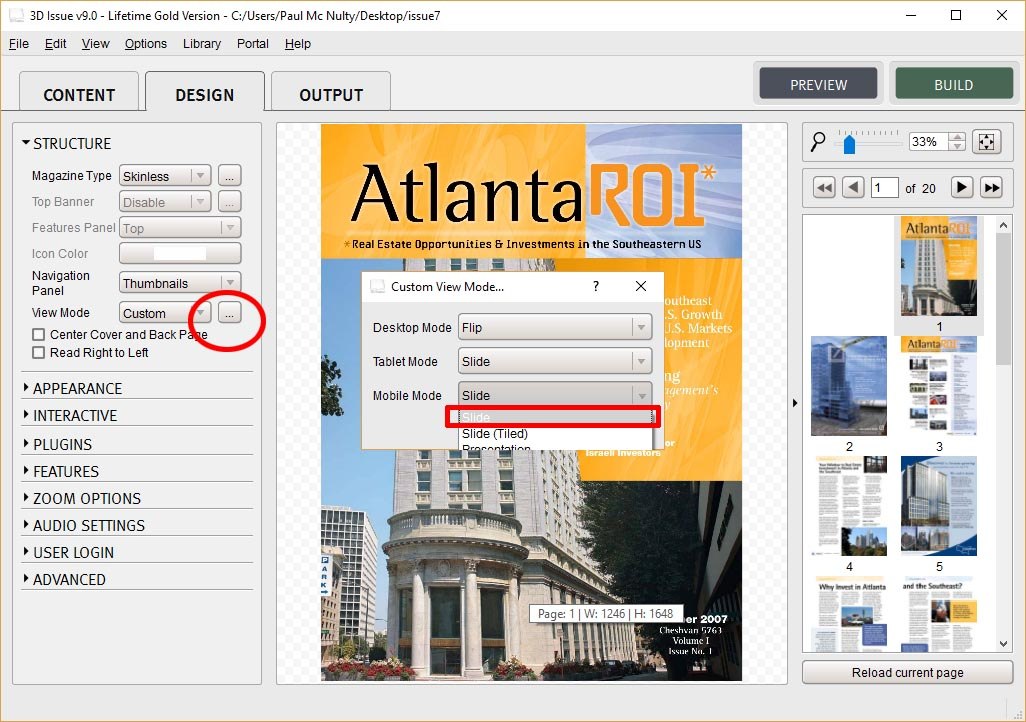 3. After selecting Custom click on the “…” button to the right of the View Mode option